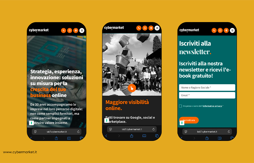 Web marketing e comunicazione digitale, ma c'è di più: il nuovo sito di Cybermarket introduce un linguaggio visivo interattivo, dove ogni passaggio del mouse attiva un'esperienza. E' così che le soluzioni digitali prendono vita