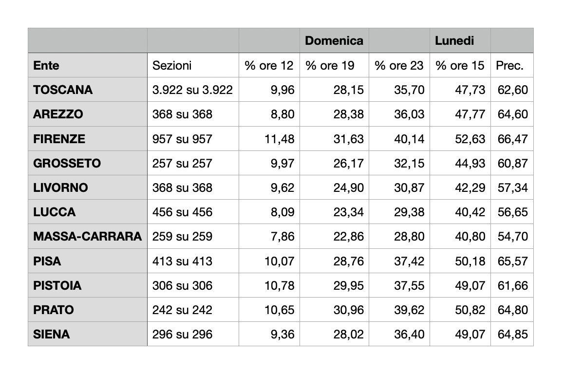 L'affluenza finale alle elezioni regionali in Toscana si attesta al 47,73% mentre nel 2020 fu del 62,60%. Di seguito i dati provincia per provincia: