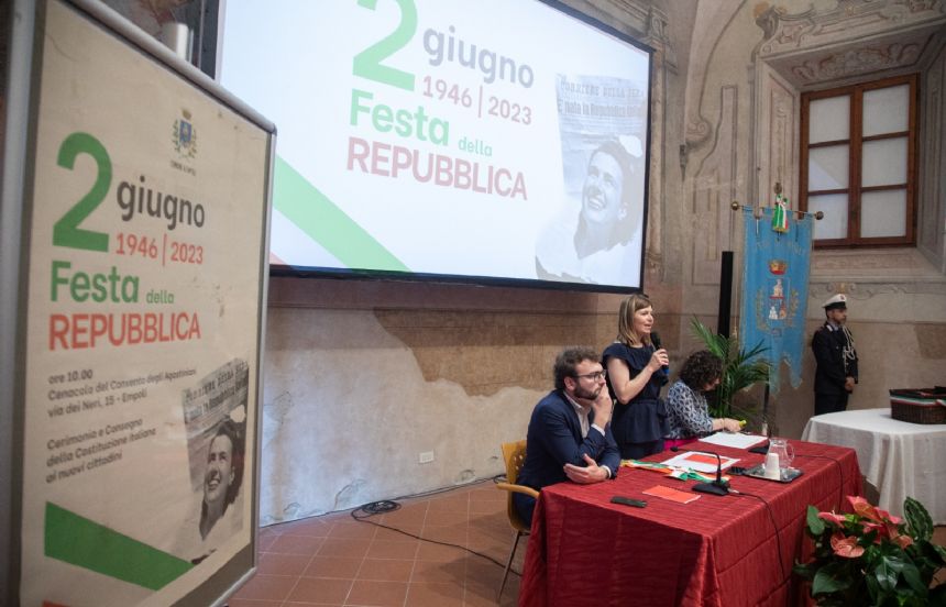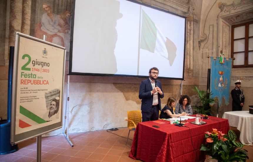 Le note dell'inno d'Italia. Cittadine e cittadini di ogni età, rappresentanti delle autorità civili e militari, rappresentanti della giunta e del Consiglio comunale della città di Empoli. Presente anche il senatore Dario Parrini. Nella mattinata di oggi, venerdì 2 Giugno 2023, si sono tenute in un Cenacolo degli Agostiniani gremito le celebrazioni per la Festa della Repubblica e la consegna della Costituzione alle nuove cittadine e ai nuovi cittadini empolesi. Nella comunità empolese hanno fatto ingresso 178 persone che, dal primo maggio 2022 al 3 maggio 2023, hanno acquistato la cittadinanza italiana: ben 68 sono nati in Italia e di questi 51 sono nati a Empoli, ma nonostante siano nati in Italia hanno dovuto fare il percorso per il riconoscimento della cittadinanza esattamente come chi ha vissuto gran parte della propria vita in un altro Paese.