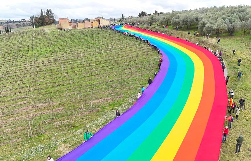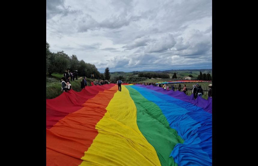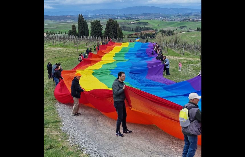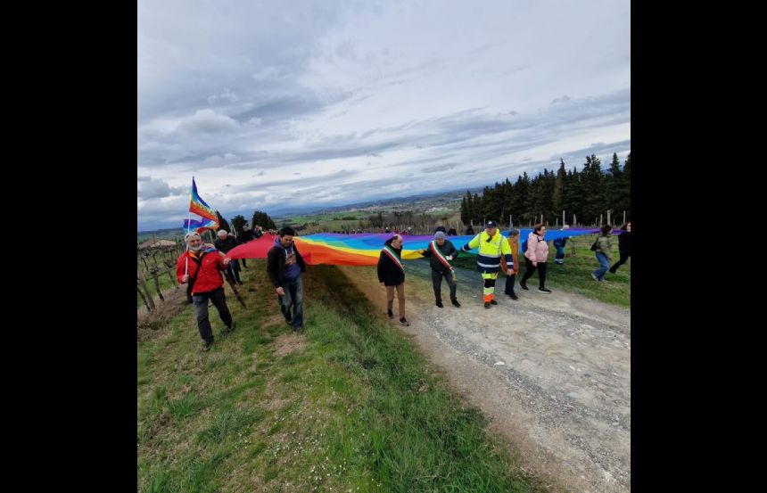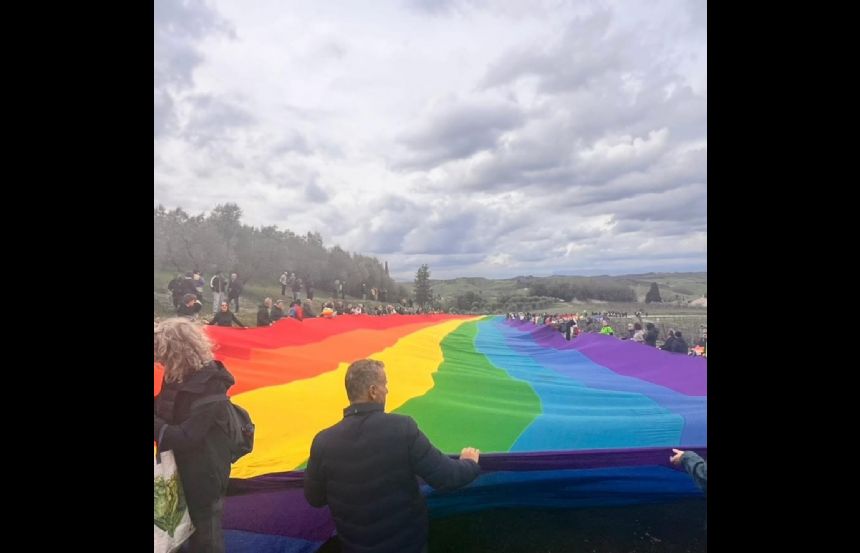 La grande bandiera arcobaleno, lunga 500 metri, è stata portata a mano dai partecipanti lungo un tratto della storica Via Francigena, trasformando il percorso in un lungo serpentone di colori tra le colline della Valdelsa. L’iniziativa ha richiamato cittadini, associazioni e amministratori locali, uniti in una camminata dal forte valore simbolico.