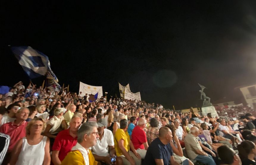 Alla fine, l’ora tarda, non stempera l’entusiasmo dei contradaioli di Porta Caracosta che alzano al cielo il drappo dipinto da Paola Imposimato.