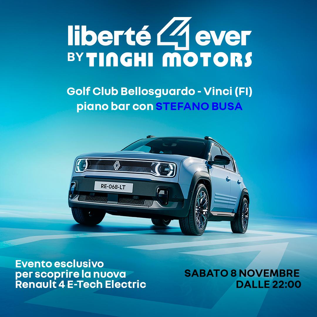 Sabato 8 novembre - Tinghi Motors, storica concessionaria Renault, Dacia e Mobilize di Empoli, presenta LIBERTÉ4EVER by Tinghi Motors, l’evento esclusivo dedicato al lancio della nuova Renault 4 E-Tech 100% Electric, nella suggestiva cornice del Golf Bellosguardo di Vinci, una delle location più affascinanti del territorio toscano, tra design, gusto e musica.
