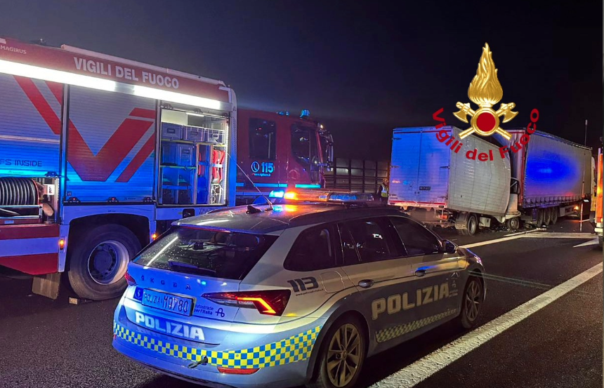 Intervento notturno dei Vigili del Fuoco e del personale sanitario dopo l’impatto di un mezzo pesante: tratto chiuso per messa in sicurezza e bonifica della carreggiata